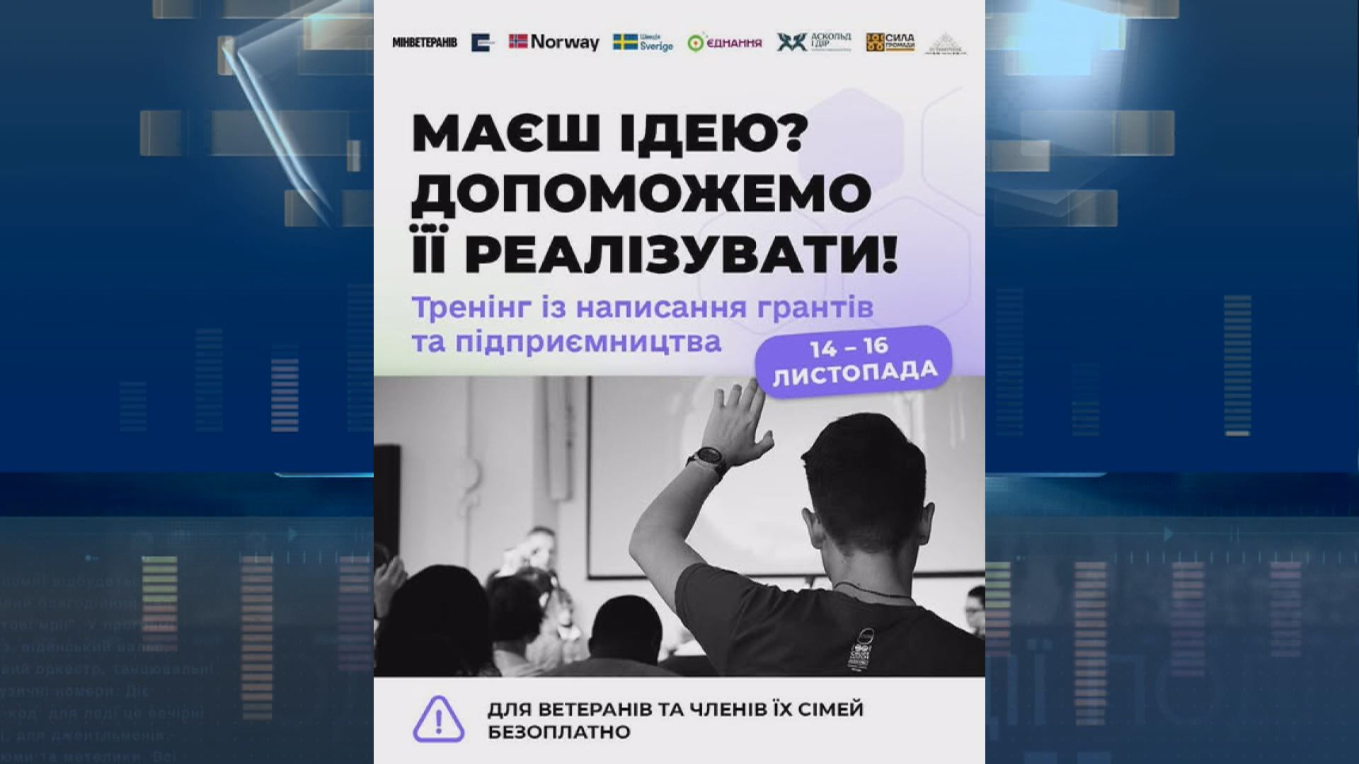 Трьохденний тренінг із грантрайтингу та підприємництва для ветеранів і членів їхніх сімей відбудеться у Коломиї. Місце проведення - простір підтримки «Гарт». Так організатори допоможуть реалізувати власну ідею або започаткувати бізнес. Проєкт реалізовується ГО «Сила Громади» в партнерстві з ГО «Трикутник» за підтримки Українського ветеранського фонду Міністерства у справах ветеранів України за співфінансування закордонних партнерів.