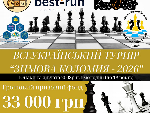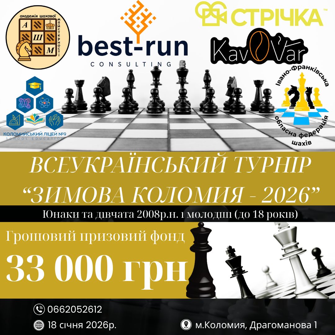 «Зимова Коломия - 2026». Триває реєстрація на Всеукраїнський шаховий турнір (серед юнаків та дівчат 2008 р.н. і молодших), який відбудеться 18 січня у Коломийському ліцеї №9. Грошовий призовий фонд - 33 000 грн.