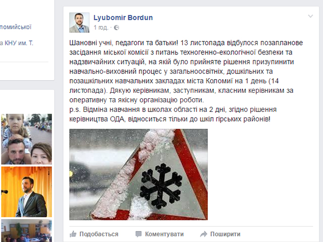 "Шановні учні, педагоги та батьки! 13 листопада відбулося позапланове засідання міської комісії з питань техногенно-екологічної безпеки та надзвичайних ситуацій, на якій було прийняте рішення призупинити навчально-виховний процес у загальноосвітніх, дошкільних та позашкільних навчальних закладах міста Коломиї на 1 день (14 листопада). Дякую керівникам, заступникам, класним керівникам за оперативну та якісну організацію роботи.